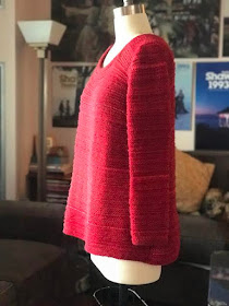 I knit the length to about 3/4's of what I wanted before the band and then I put it on my mannequin for about 48 hours. I had to take it off and do the neckline part way because it was stretching out too much to be sure about the overall length. Once I knit the neckband I got a much more accurate length. The armholes also looked a little sloppy but after I did the neckline I realized the sleeve seams were going to take care of them as well. I did a saddle shoulder which may have added to the stretch there.